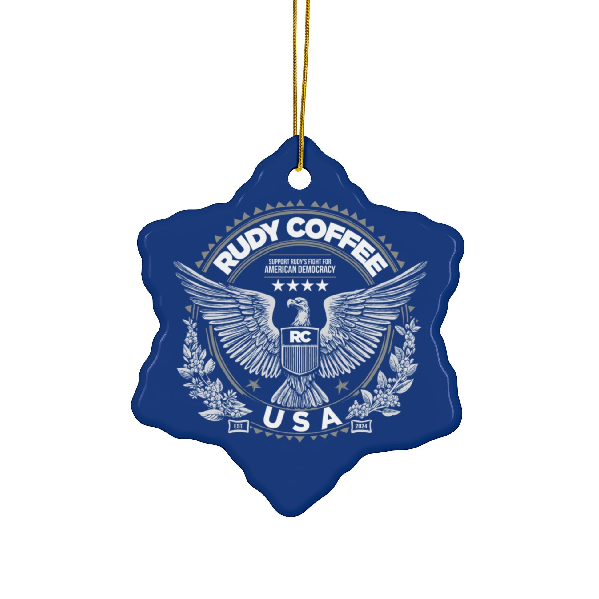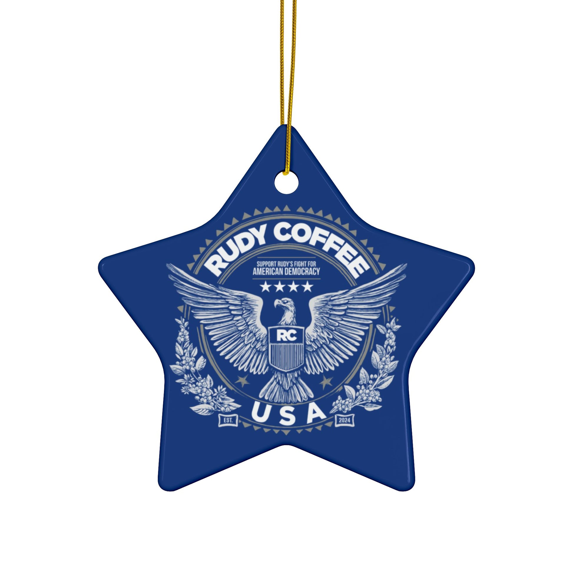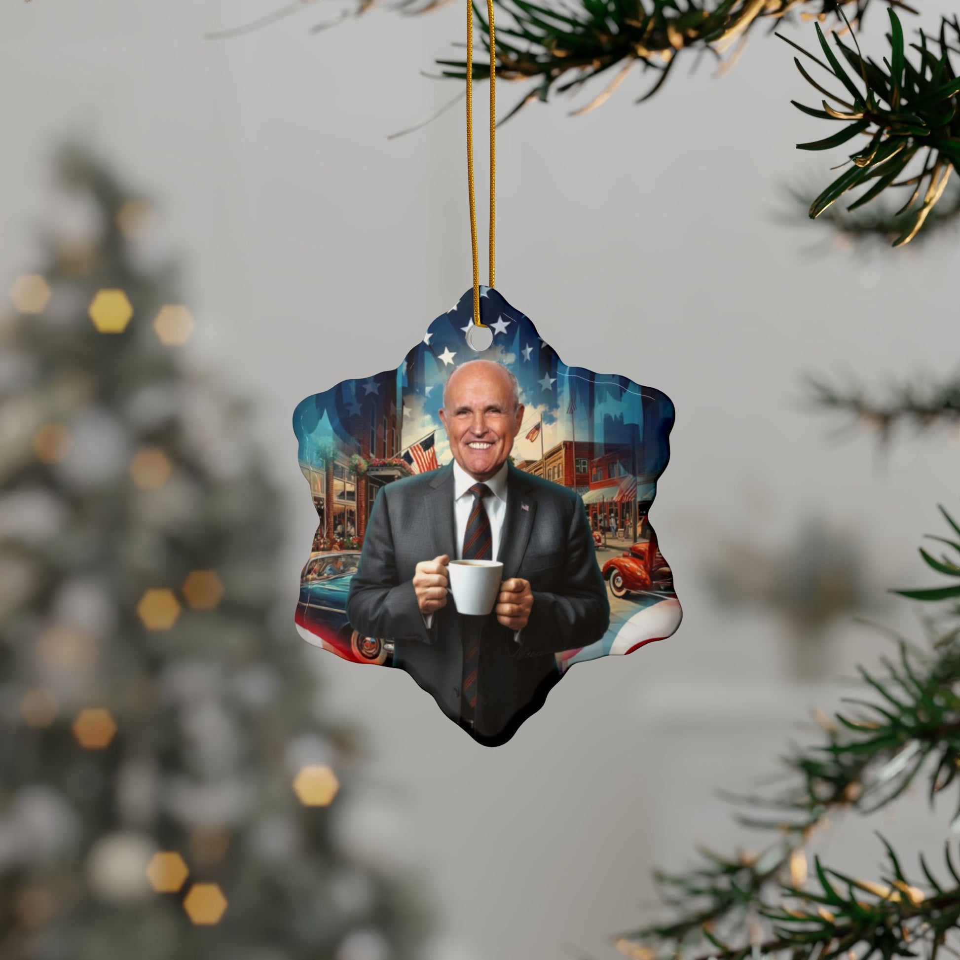 Celebrate the warmth of community and the strength of spirit with this unique Rudy Coffee USA ceramic ornament. The front features an image of Rudy Giuliani, America’s Mayor, enjoying a proud moment with a steaming cup of his favorite brew. Behind him, the nostalgic charm of Main Street in an American small town reflects his dedication to community and tradition.