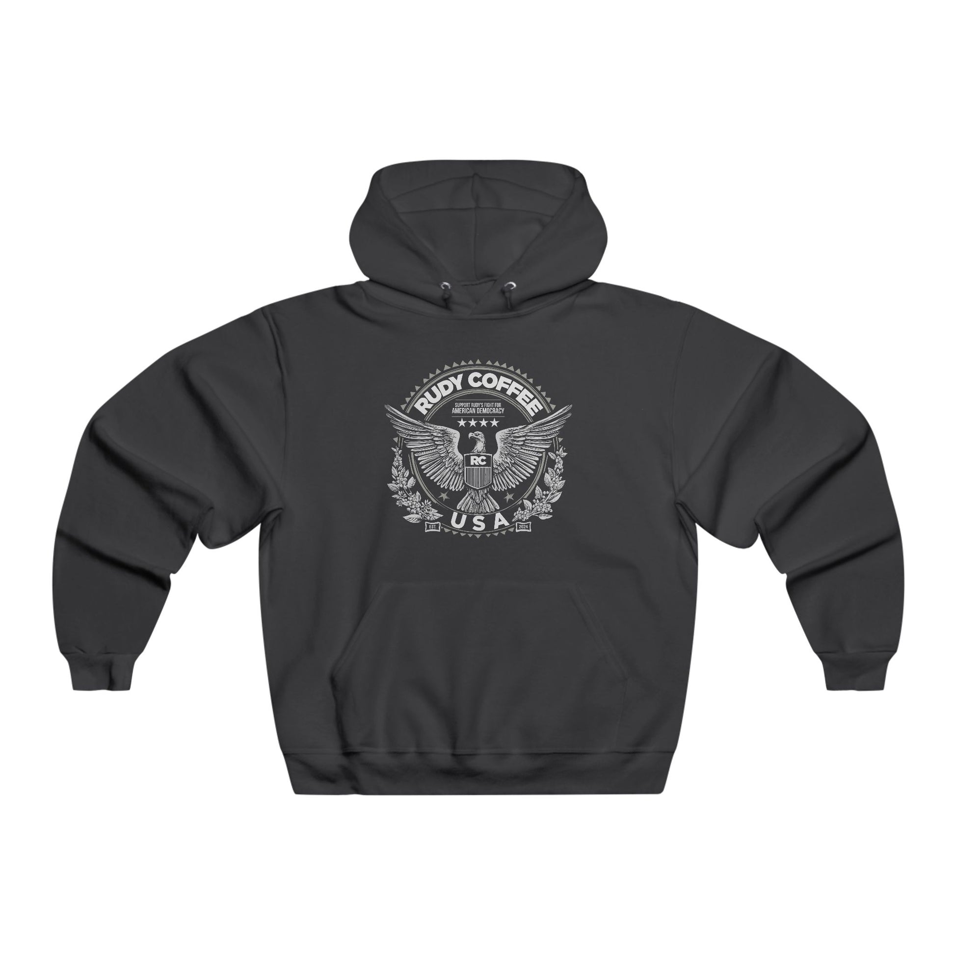 Fuel your passion for freedom, resilience, and the art of coffee with the Rudy Coffee USA Hoodie, designed for those who rise above every challenge. The front graphic showcases a powerful eagle with wings spread wide within an official-style seal, embodying strength and the drive to soar higher. Stamped with "Rudy Coffee USA" and framed by elegant silhouettes of flowering coffee plants, this design pays tribute to the artistry and heritage of coffee-making. Two subtle "Est. 2024" boxes mark the launch of Rudy Coffee, making this hoodie not just a statement but a celebration of craftsmanship and courage.