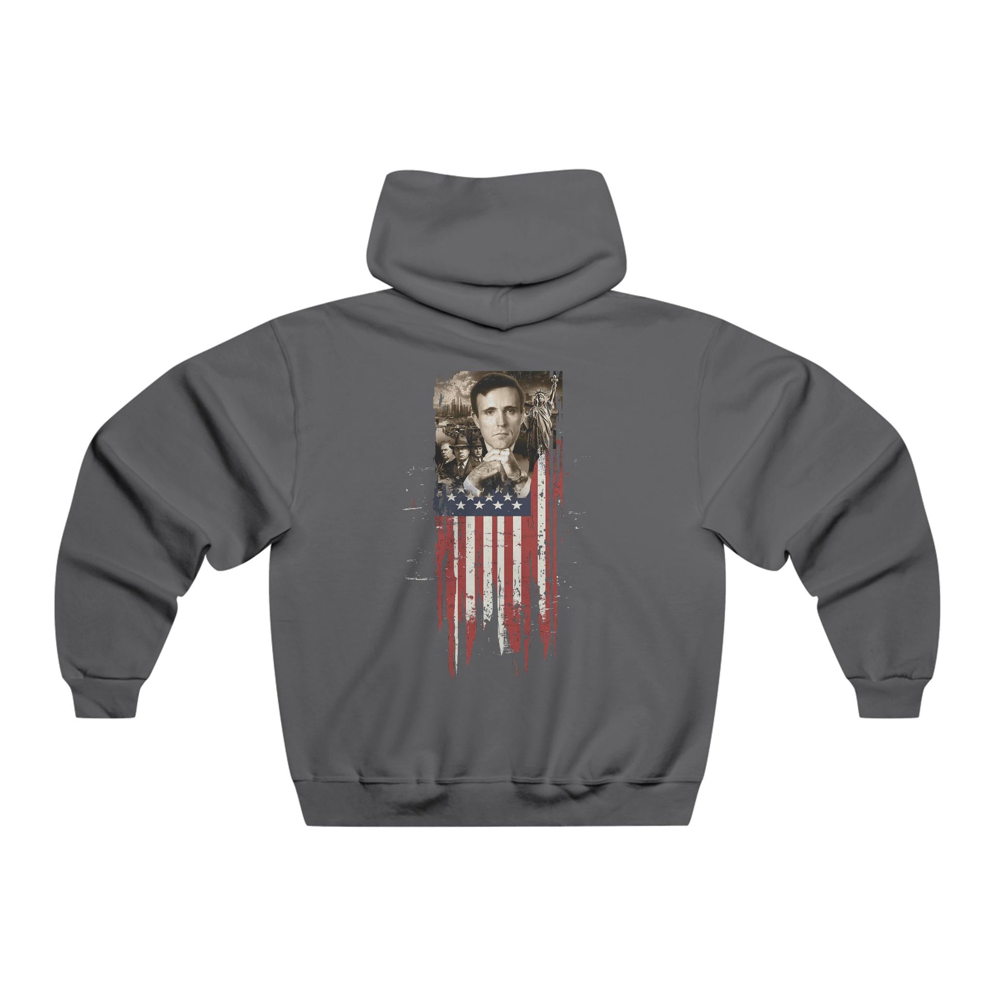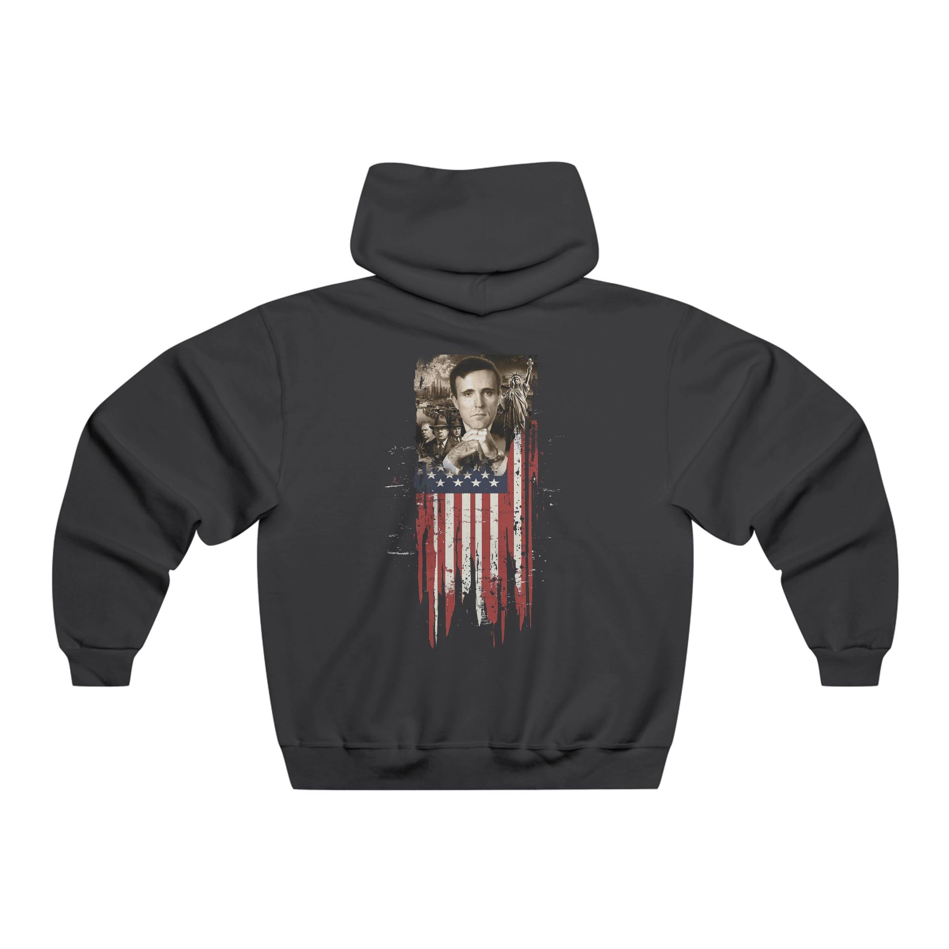 On the back, a young Rudy Giuliani stands against a New York City backdrop, a symbol of unwavering dedication. With shadowed figures representing his stand against the mob and the Statue of Liberty by his side, this image captures a fearless pursuit of justice. Beneath, a worn yet resilient American flag reminds us to never back down and always stand up for what we believe in.