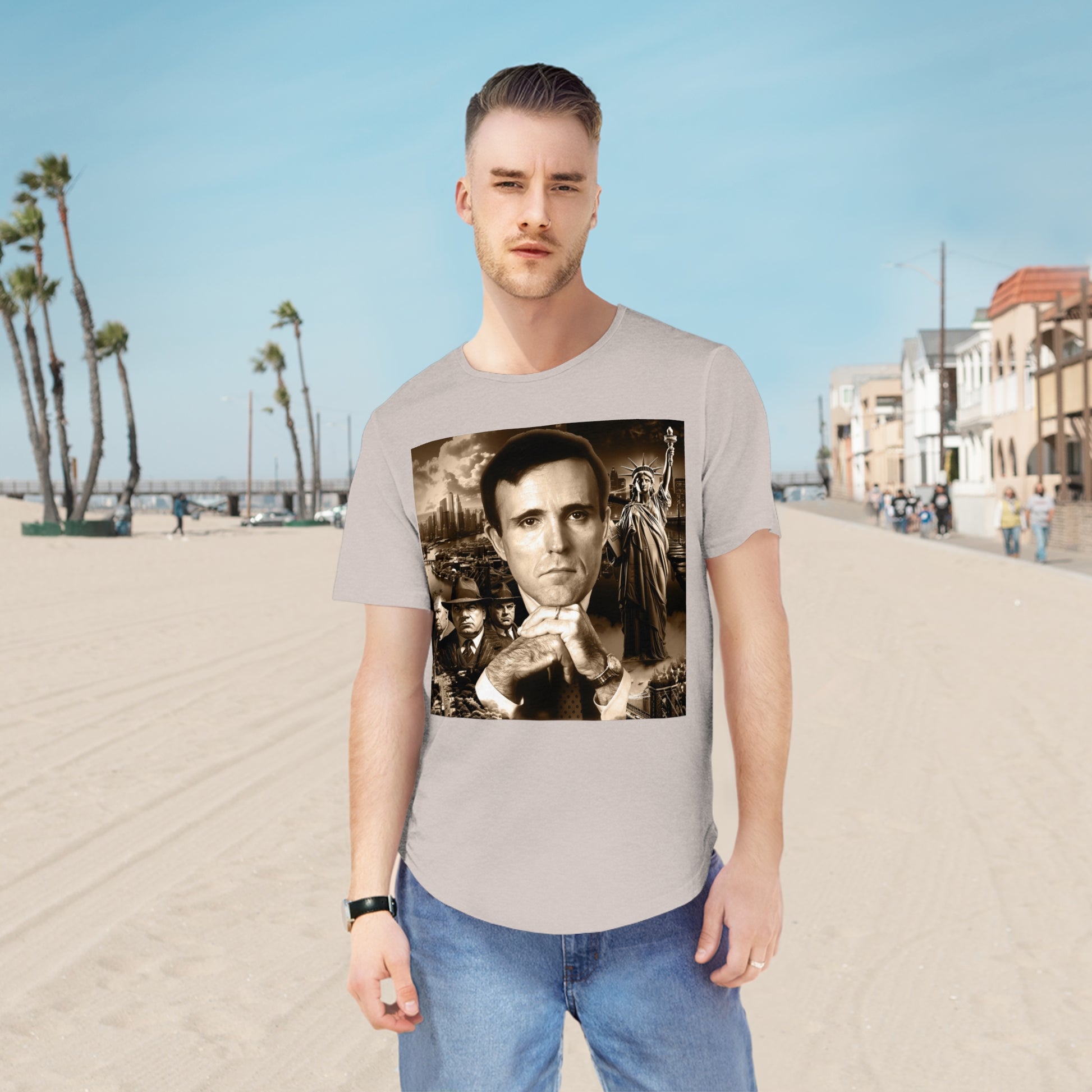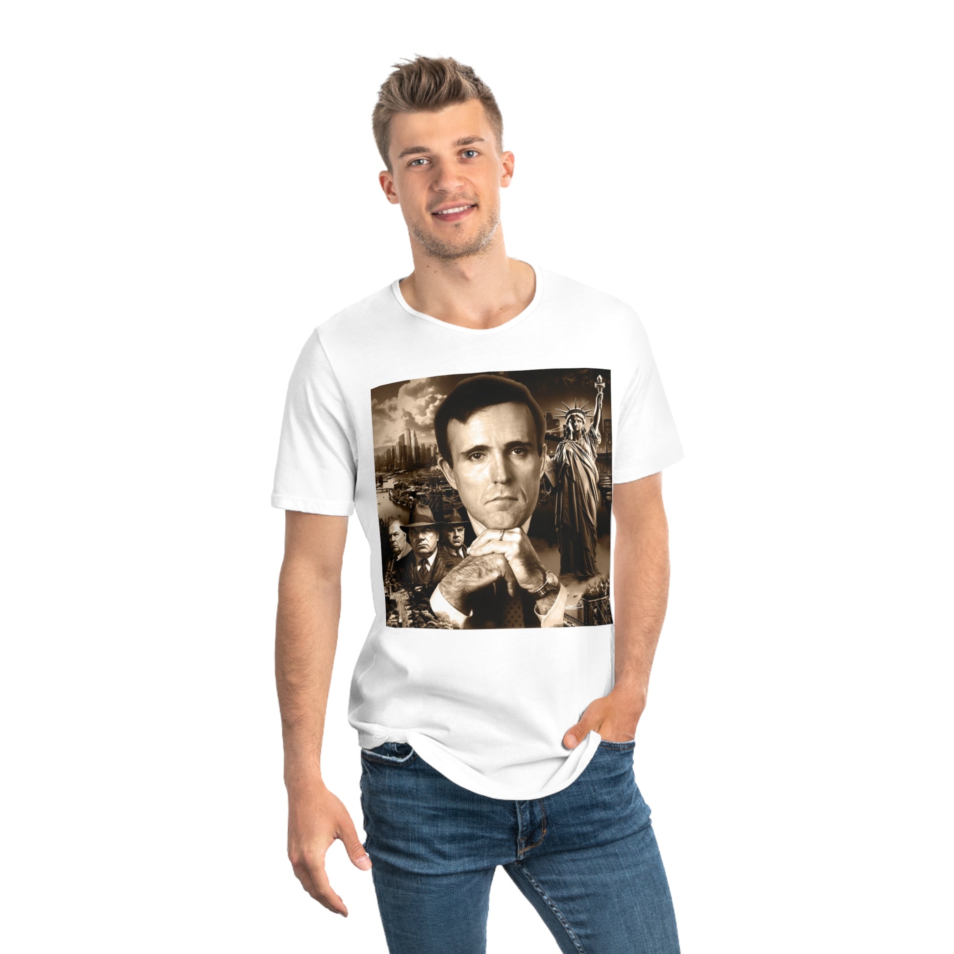 Celebrate the grit of New York City with this unique jersey short sleeve tee, featuring a powerful print of young Rudy Giuliani. Captured in his days of taking down the mob and fighting for liberty and justice, Rudy’s portrait is set against iconic NYC elements: mob characters symbolizing the fight he led, and the Statue of Liberty representing freedom. It’s the perfect blend of strength and resilience, designed for those who appreciate a strong brew and an even stronger sense of purpose.