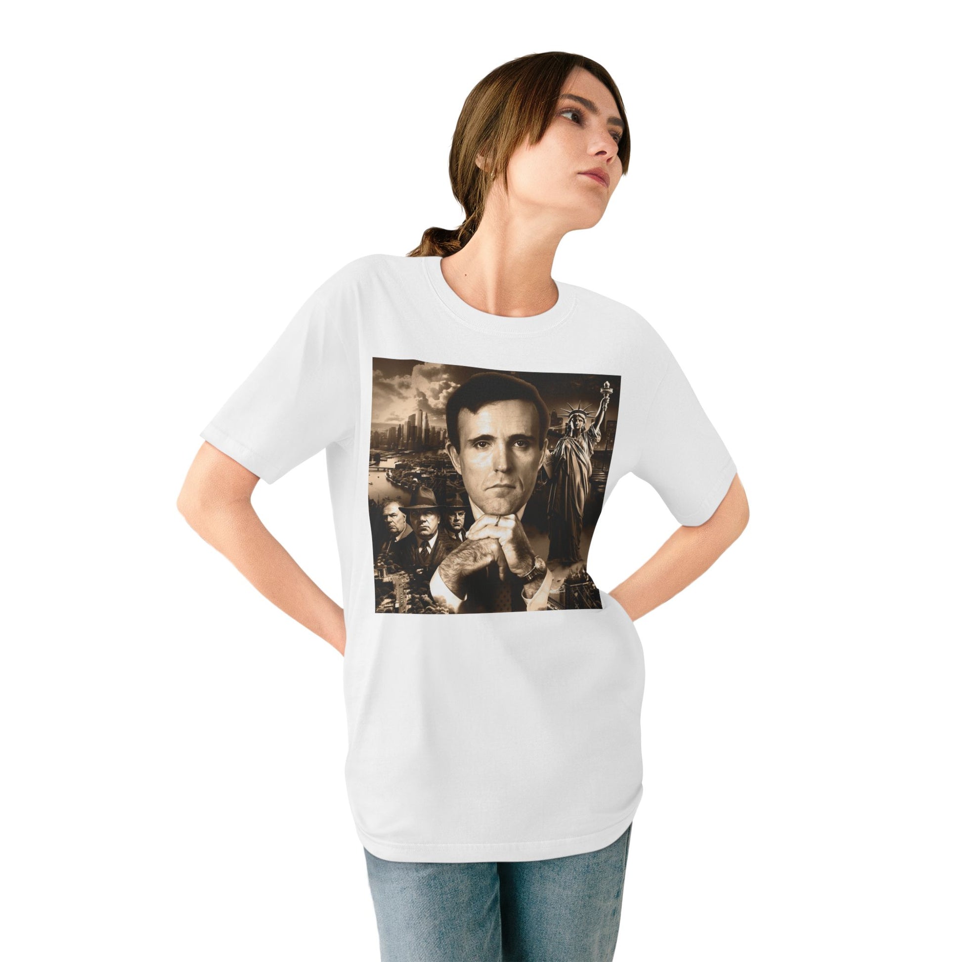 This eco-friendly Rudy Coffee organic cotton t-shirt, featuring a striking portrait of young Rudy Giuliani in the heart of New York City. Known for taking on the mob and defending liberty and justice, Rudy’s image is surrounded by symbols of his legacy—the Statue of Liberty stands tall alongside, and shadowed mob characters represent the challenges he overcame. This tee celebrates Rudy’s unwavering spirit and dedication to justice.